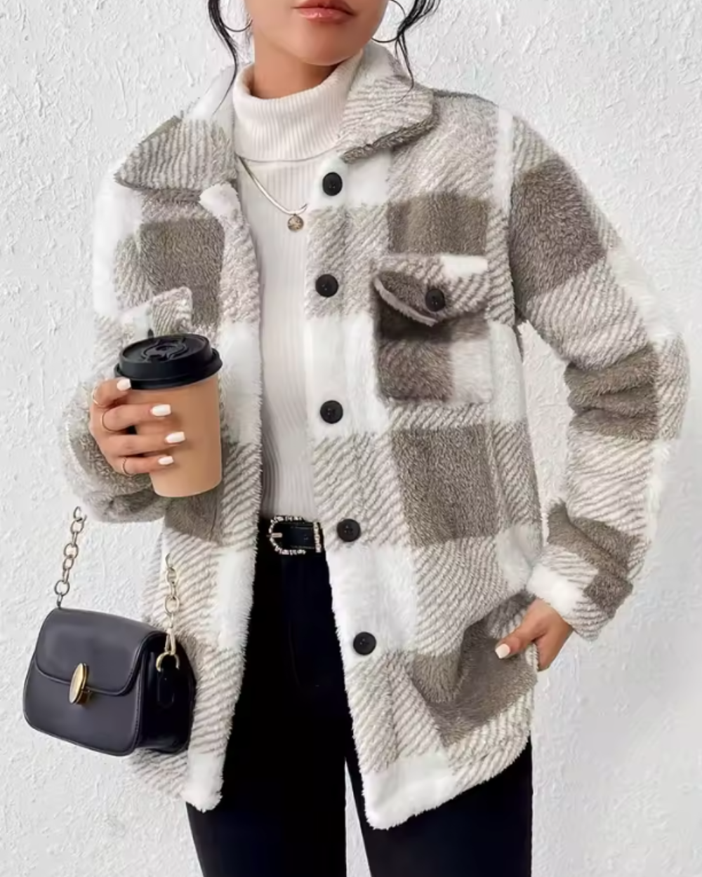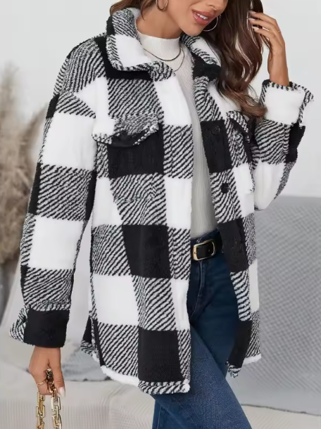 Elegancki, jesienny płaszcz damski w klasyczną kratę, zapinany na guziki, idealny wybór na chłodniejsze dni. Puszysty materiał zapewnia przyjemne ciepło i wygodę, natomiast kołnierz i obniżona linia ramion dodają stylowego luzu i nowoczesnego charakteru.