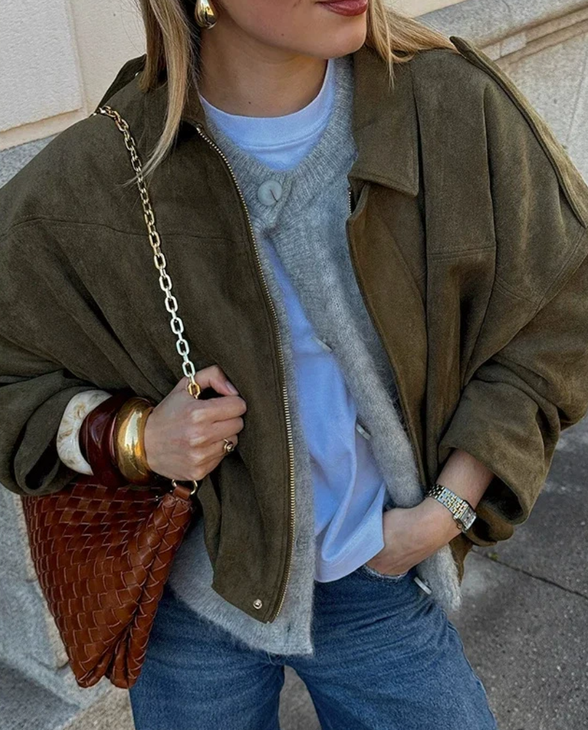 Ta oliwkowa kurtka damska wykonana z miękkiego zamszu to połączenie elegancji i swobodnego kroju oversize. Klasyczny kołnierz i ukryte zapięcie nadają jej czysty, minimalistyczny wygląd, a delikatna faktura materiału dodaje luksusowego charakteru. Idealna do jeansów i casualowych stylizacji.